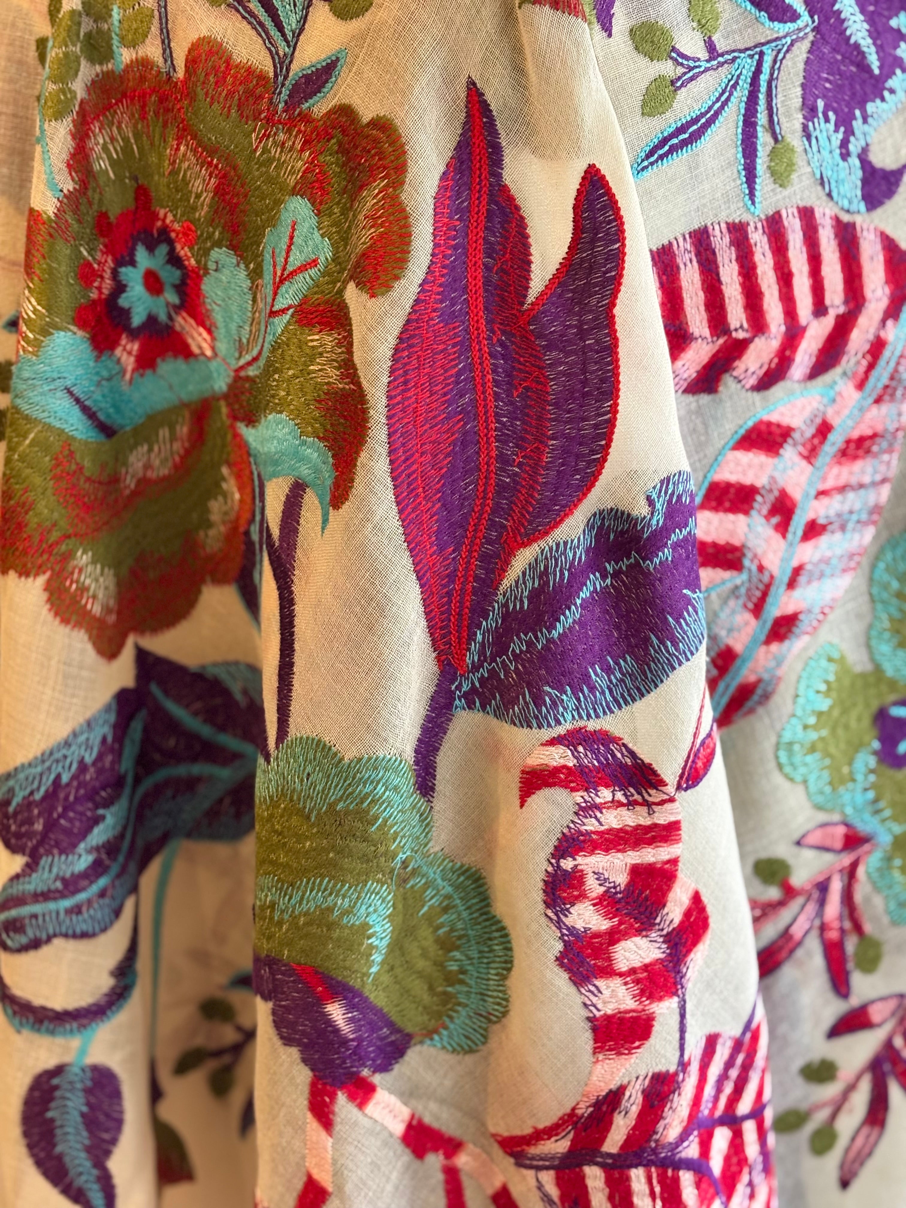 Xale em lã merino bordado em fio de seda com motivos florais. Flores tamanho maxi trazem para este xale uma linguagem moderna.