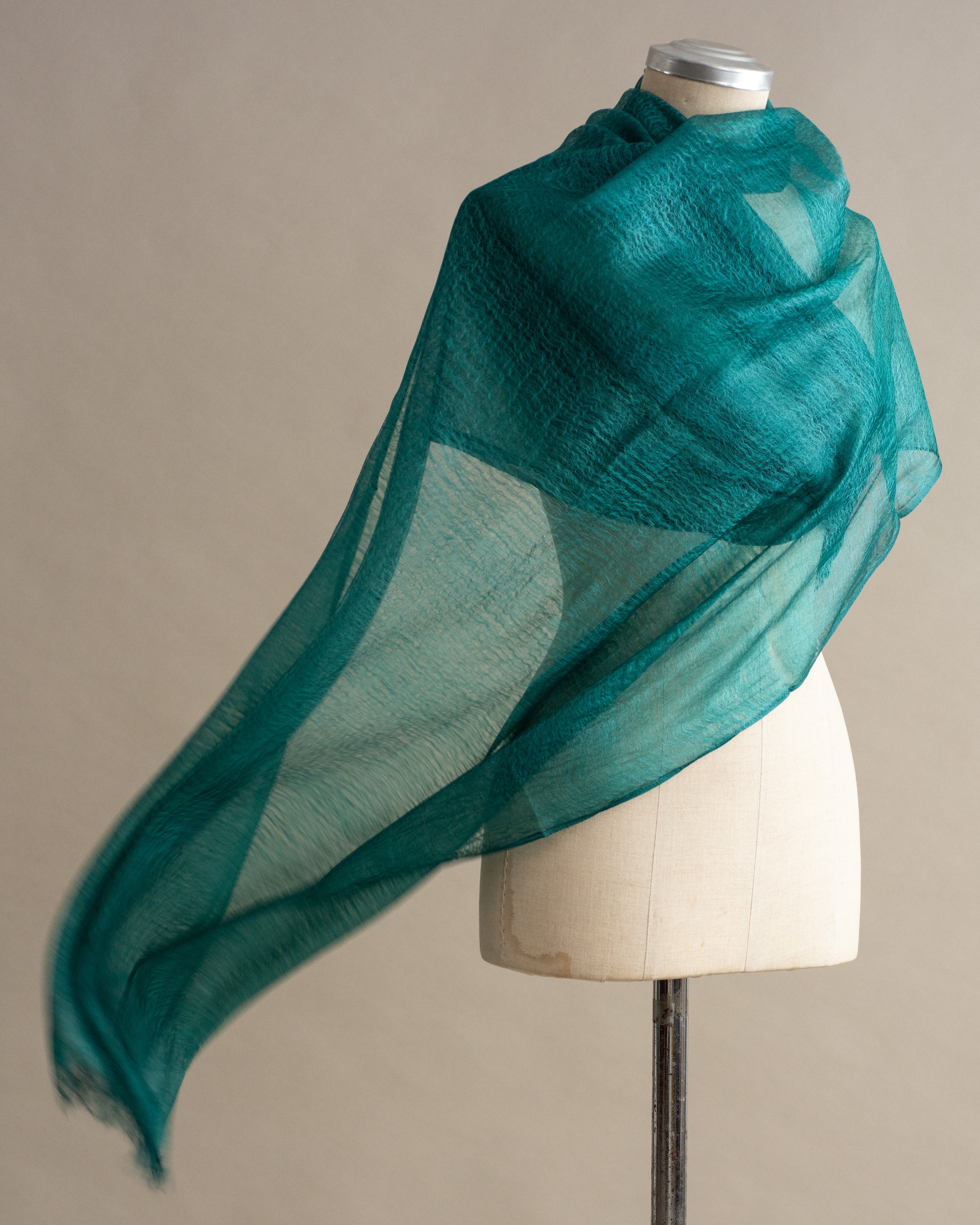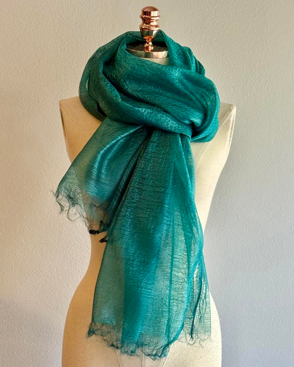 O xale de GAZE DE SEDA tussar é uma peça delicada, confeccionada com uma seda natural, de brilho discreto, textura levemente rústica e acabamento translúcido. A seda tussar é produzida a partir de casulos silvestres. Nossa finíssima gaze é feita em tear manual. Por ser uma trama aberta e arejada, torna o xale leve e ideal para ser usado no verão, compor looks sofisticados ou de festa.