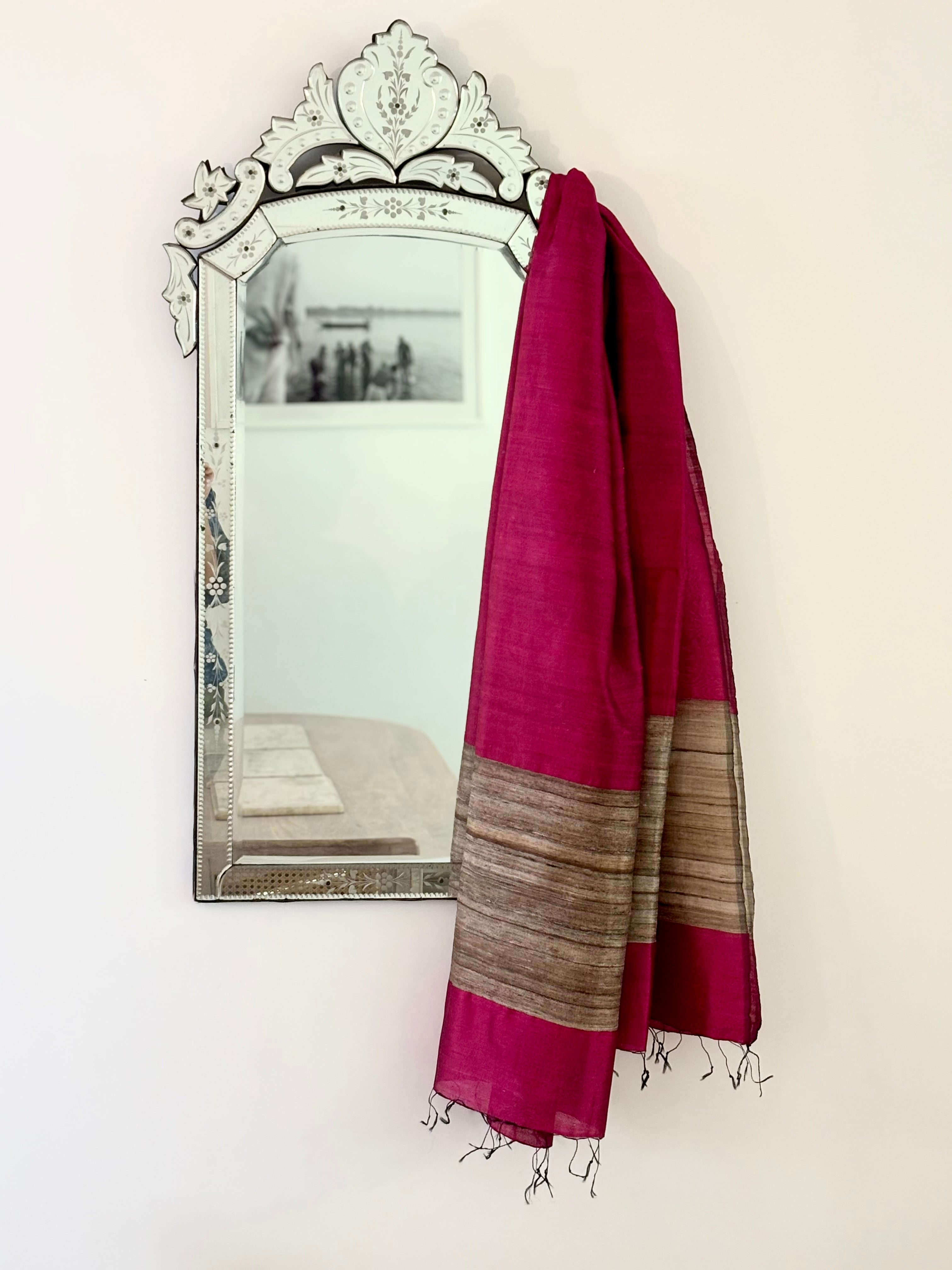 Cor fuchsia com borda em tom natural da seda tussar.