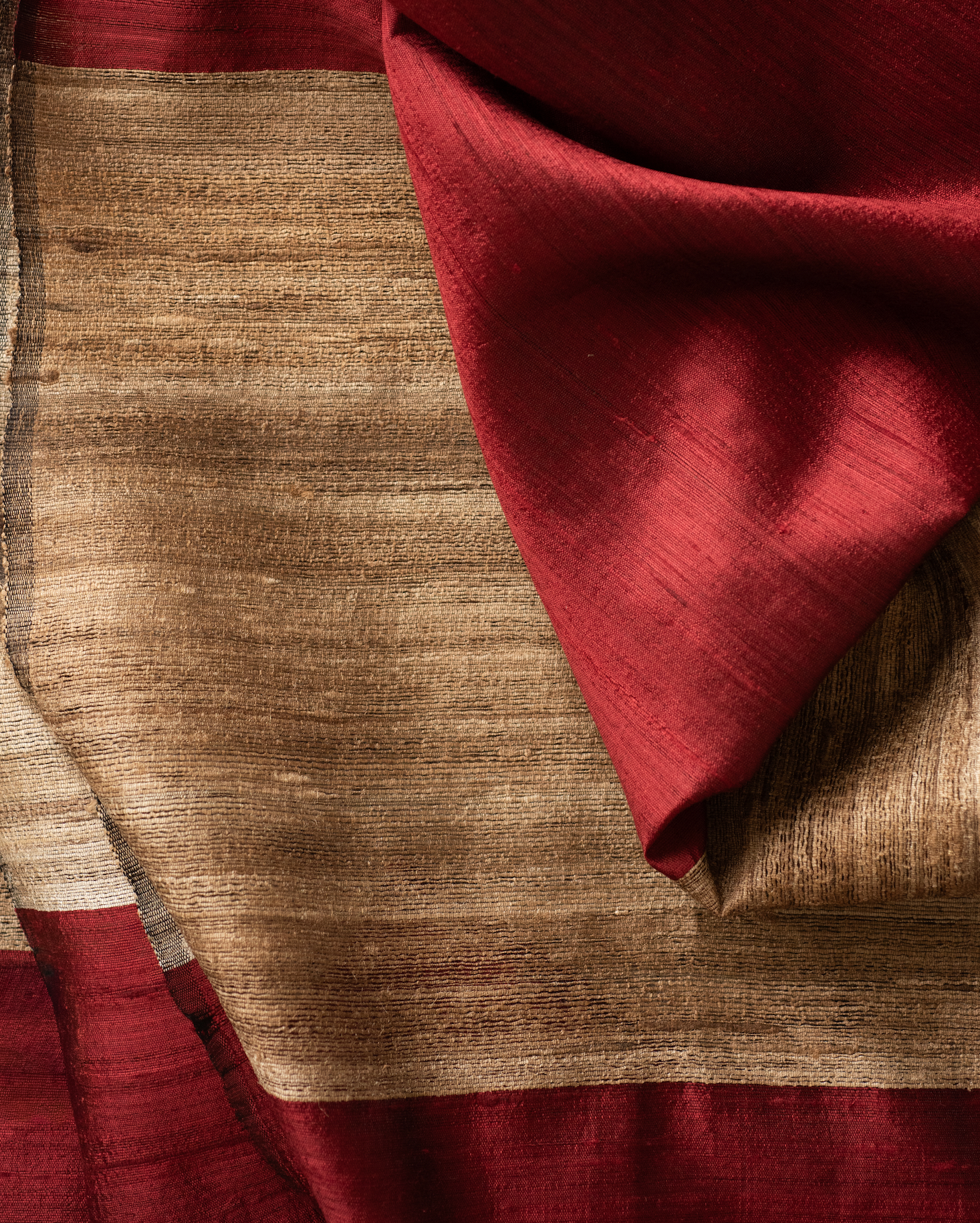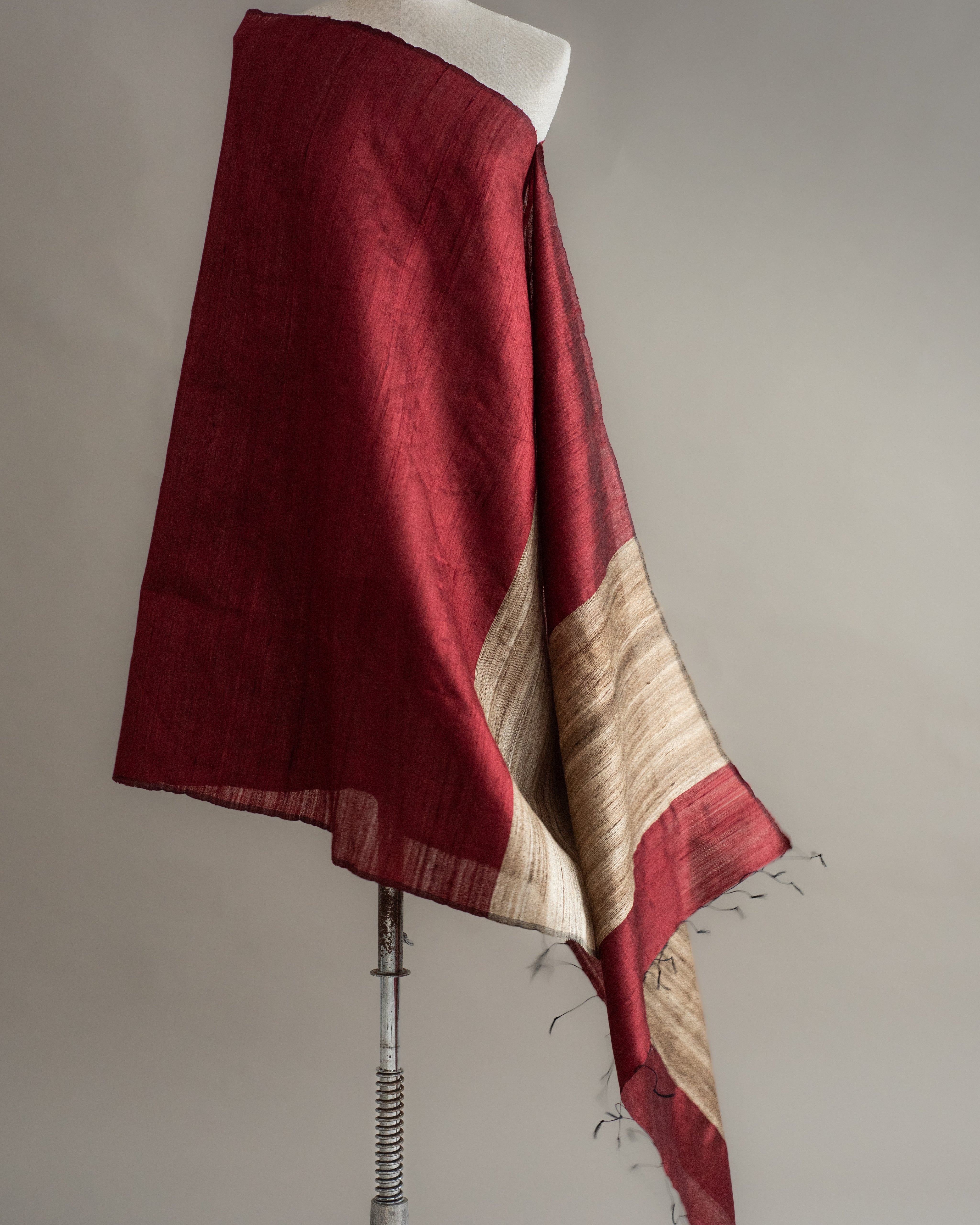 Cor marsala com borda em tom natural da seda tussar.