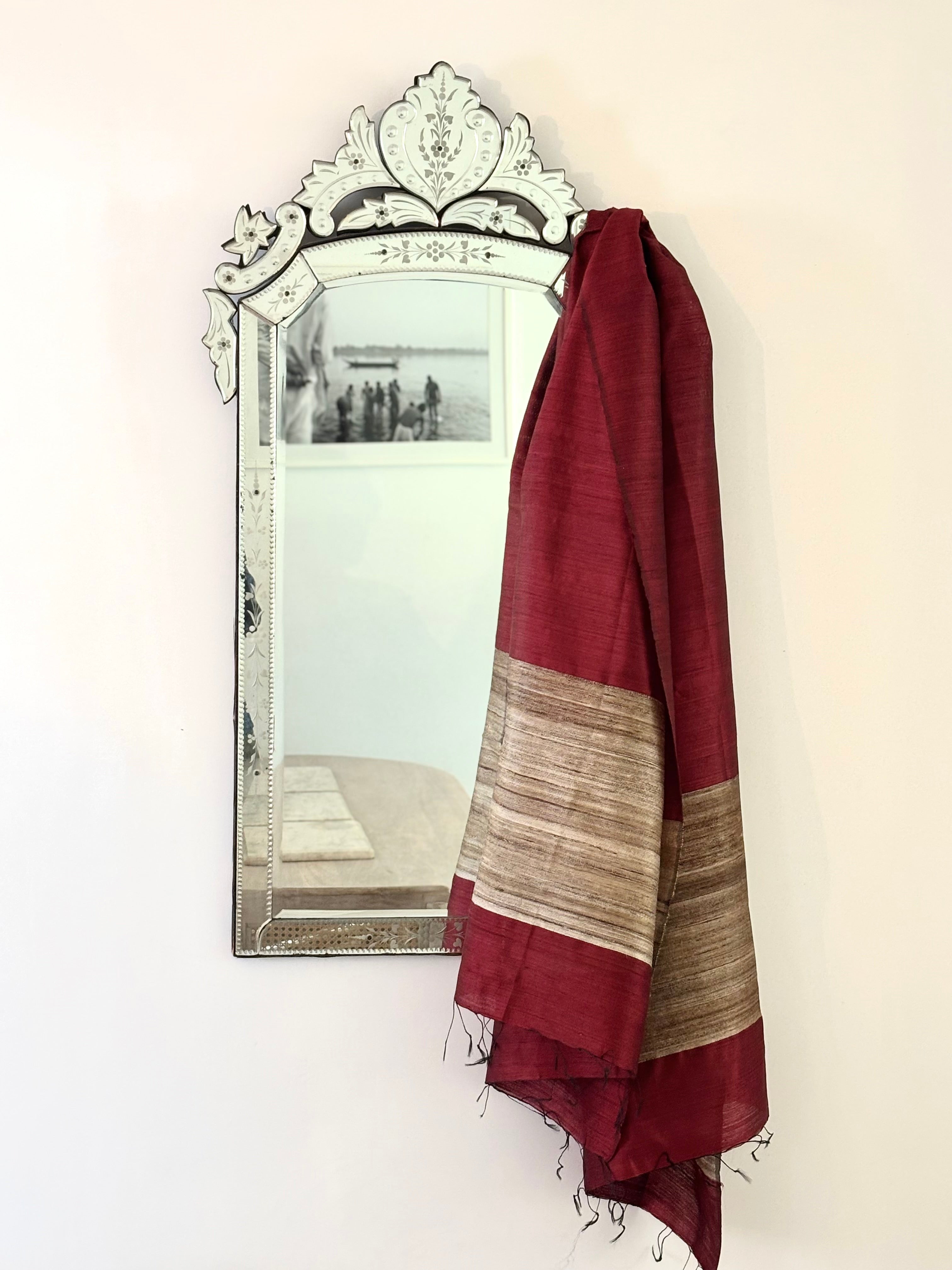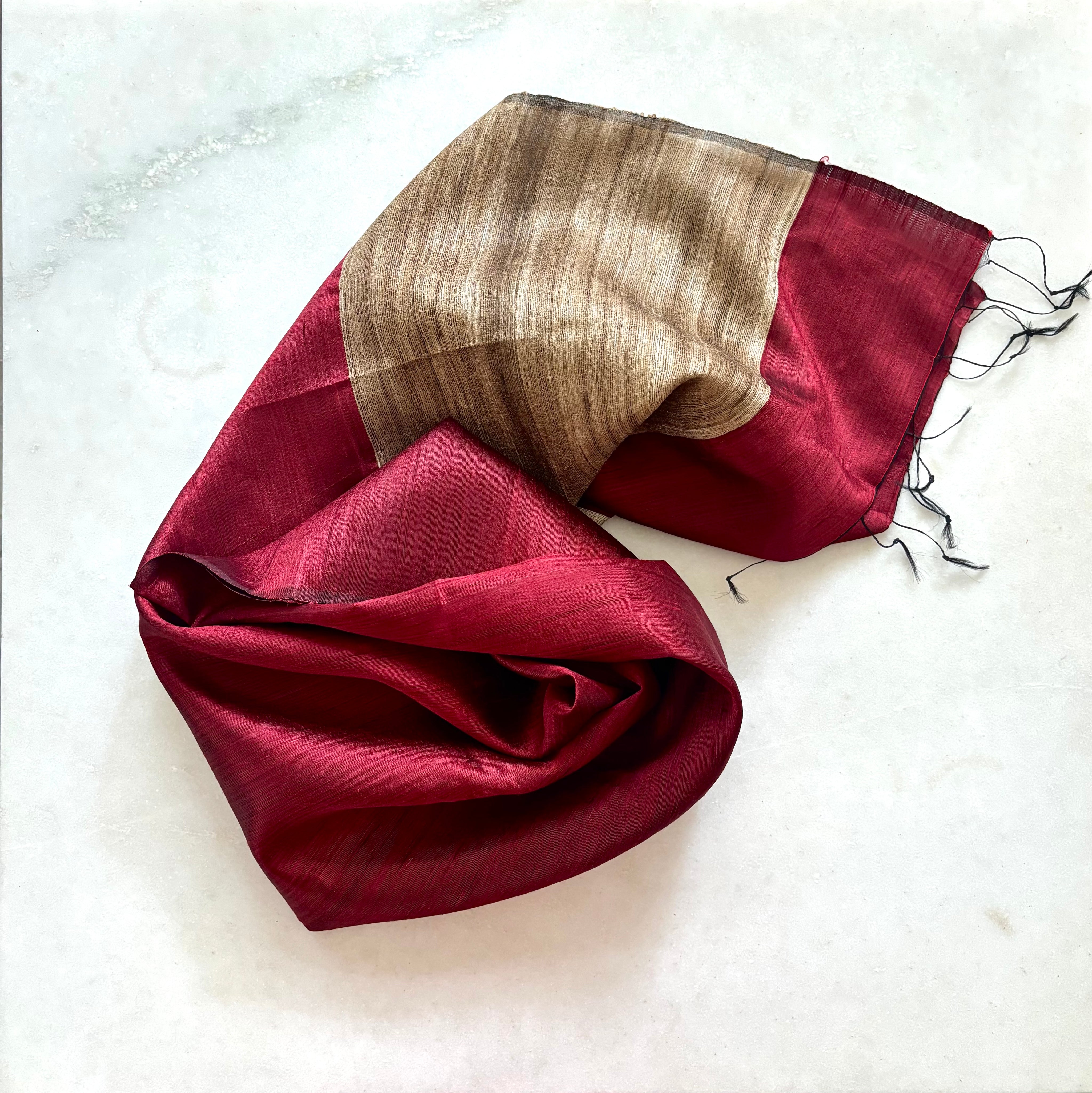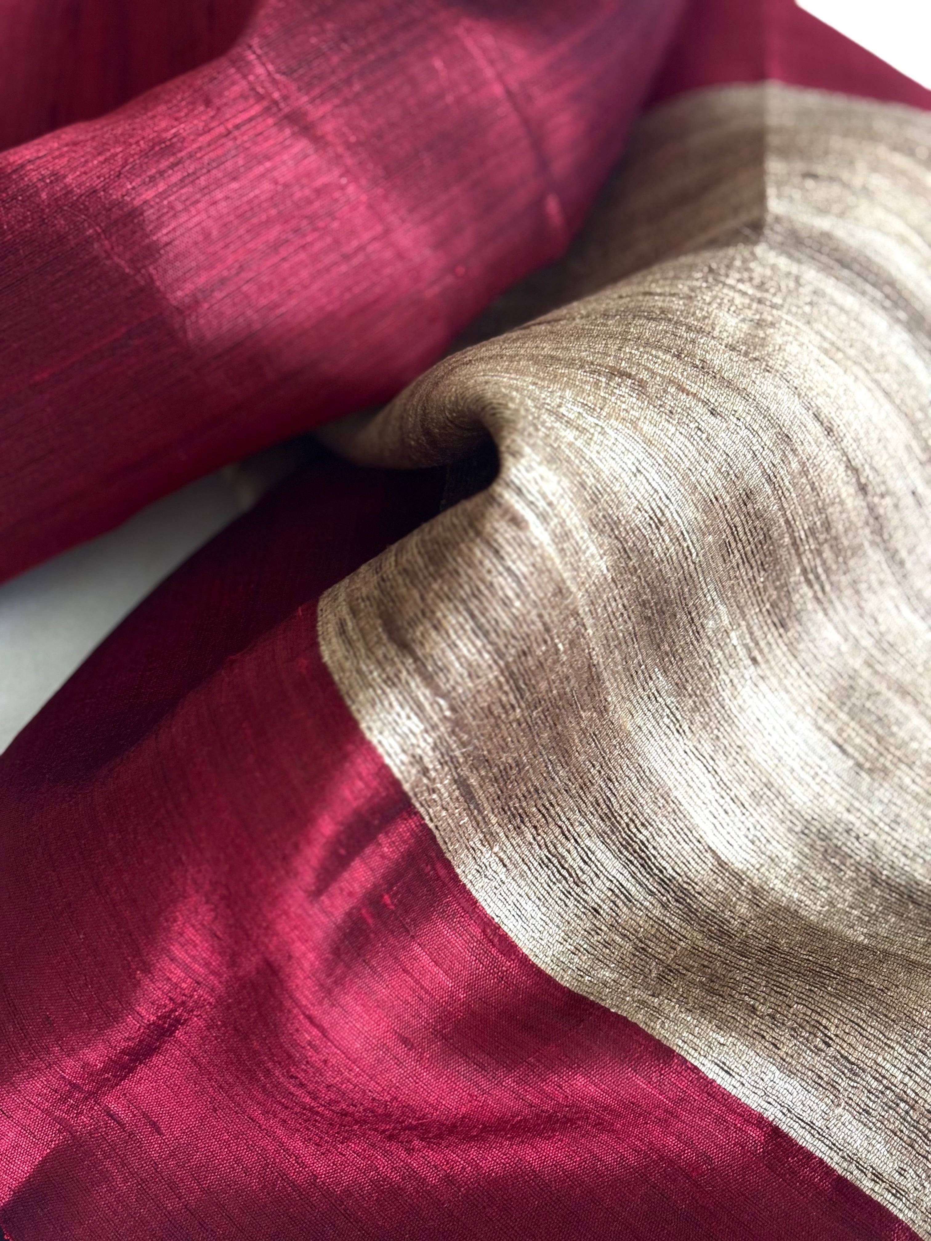 Este xale de Seda Tussar também chamada selvagem é uma peça inteiramente artesanal. Os casulos destas seda são silvestres e não de cultivo. Ele são fervidos e desenrolados manualmente e depois tecidos em antigos tradicionais teares da região de Baghalpur, na India. Esta região é conhecida por ser grande produtora de sedas tussar. Um xale tamanho extra grande, textura leve, muito macio, cores brilhantes. Acabamento em finas franjas enroladas manualmente.Seu brilho e textura de extrema elegância fazem dele um xale para acompanhar trajes de festa.