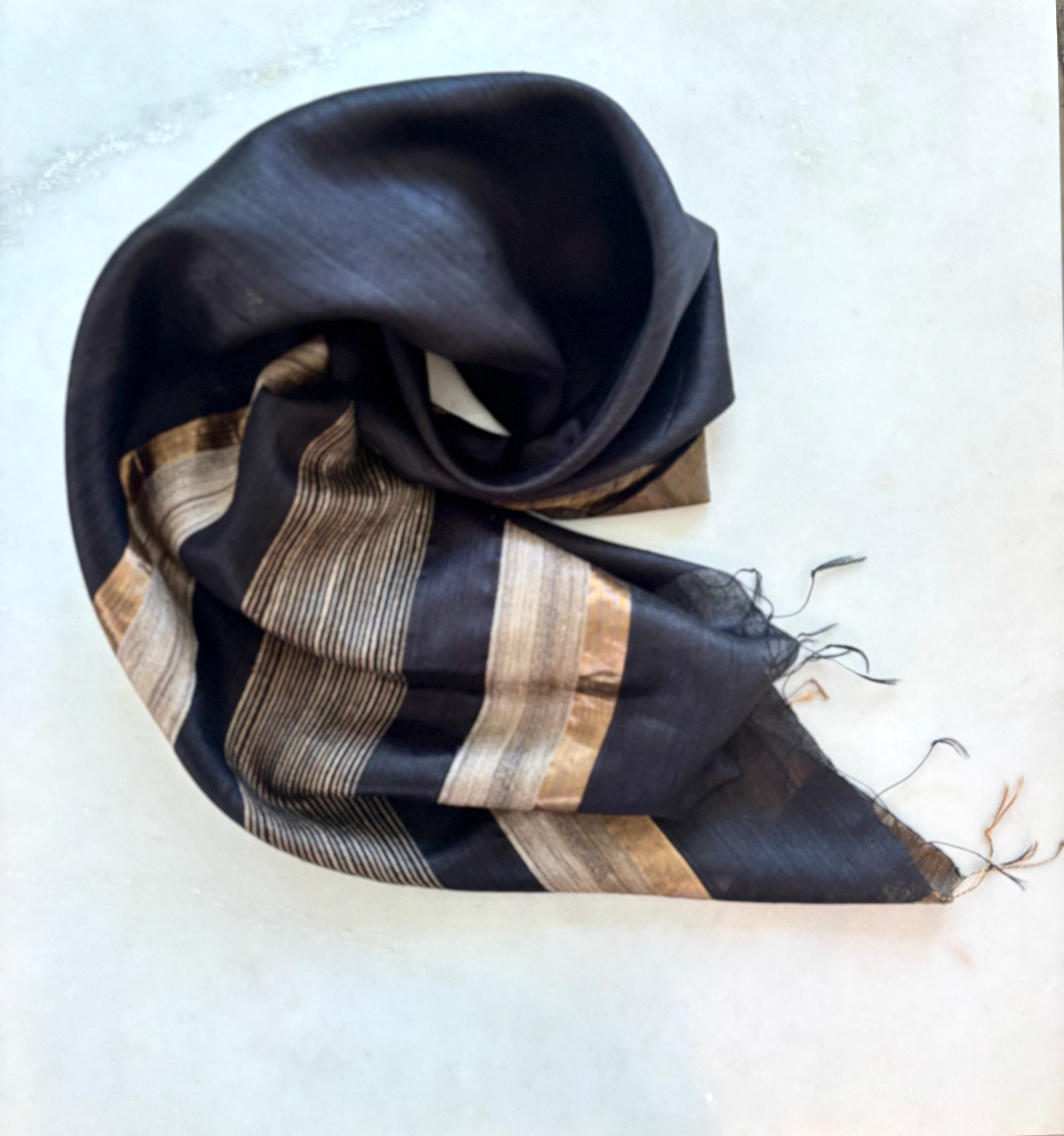 Este xale de Seda Tussar também chamada selvagem é uma peça inteiramente artesanal. Os casulos destas seda são silvestres e não de cultivo. Ele são fervidos e desenrolados manualmente e depois tecidos em antigos tradicionais teares da região de Baghalpur, na India. Esta região é conhecida por ser grande produtora de sedas tussar. Um xale tamanho extra grande, textura leve, muito macio, cores brilhantes. Acabamento em finas franjas enroladas manualmente.Seu brilho e textura de extrema elegância fazem dele um xale para acompanhar trajes de festa.