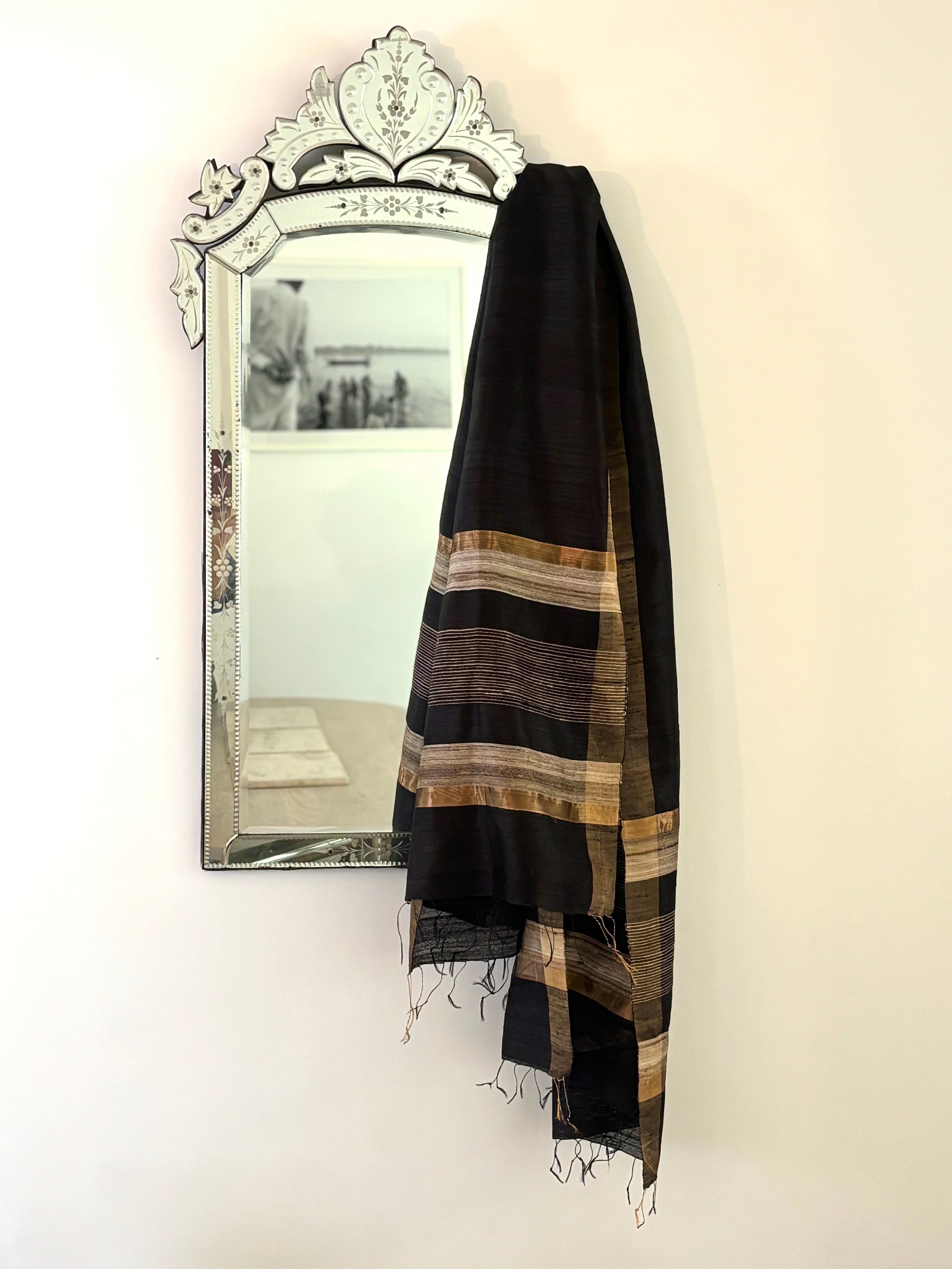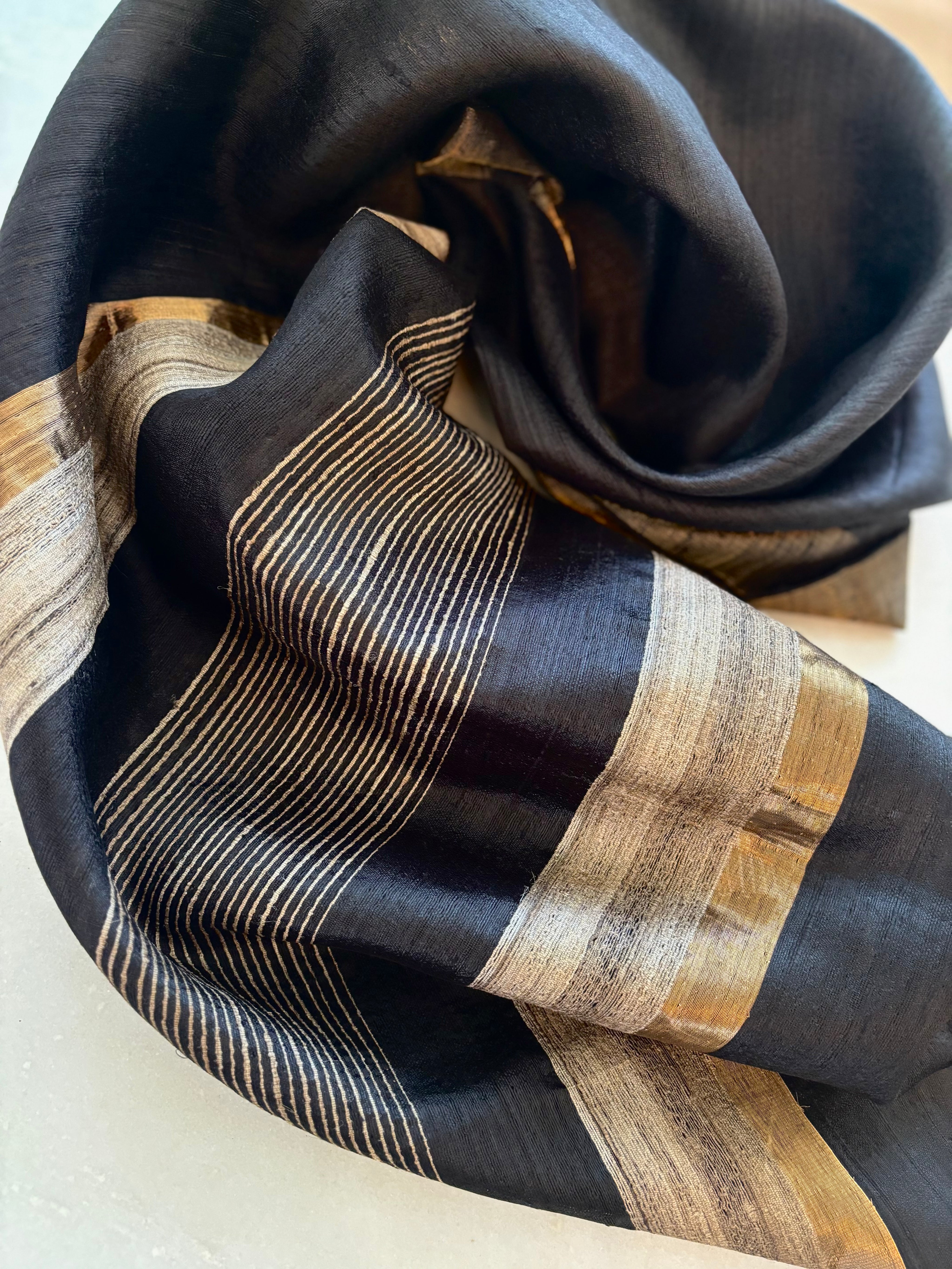 Cor preto com borda em tom natural da seda tussar e zari dourado