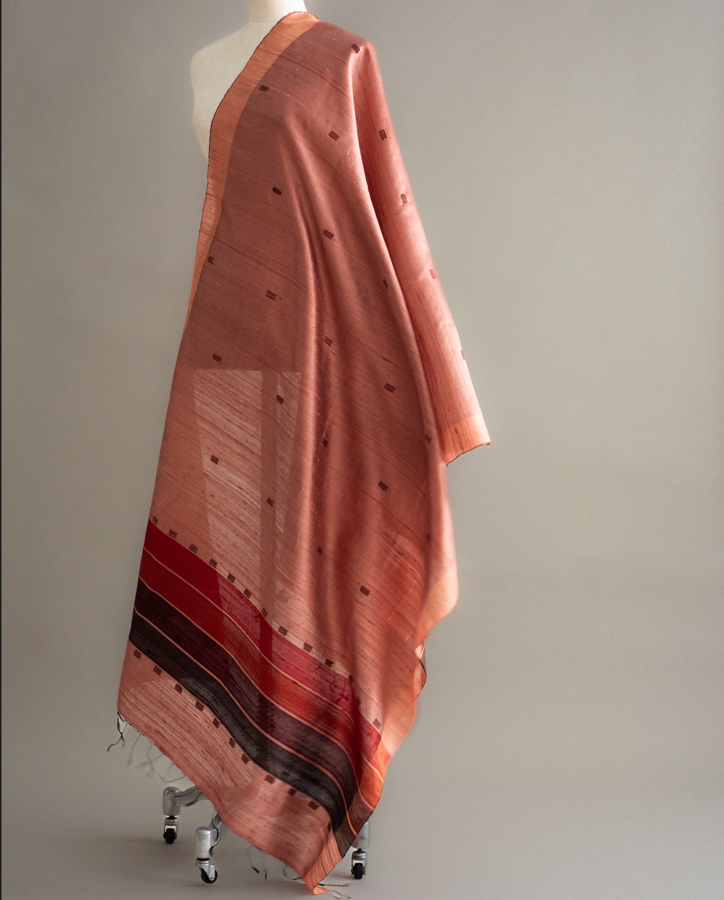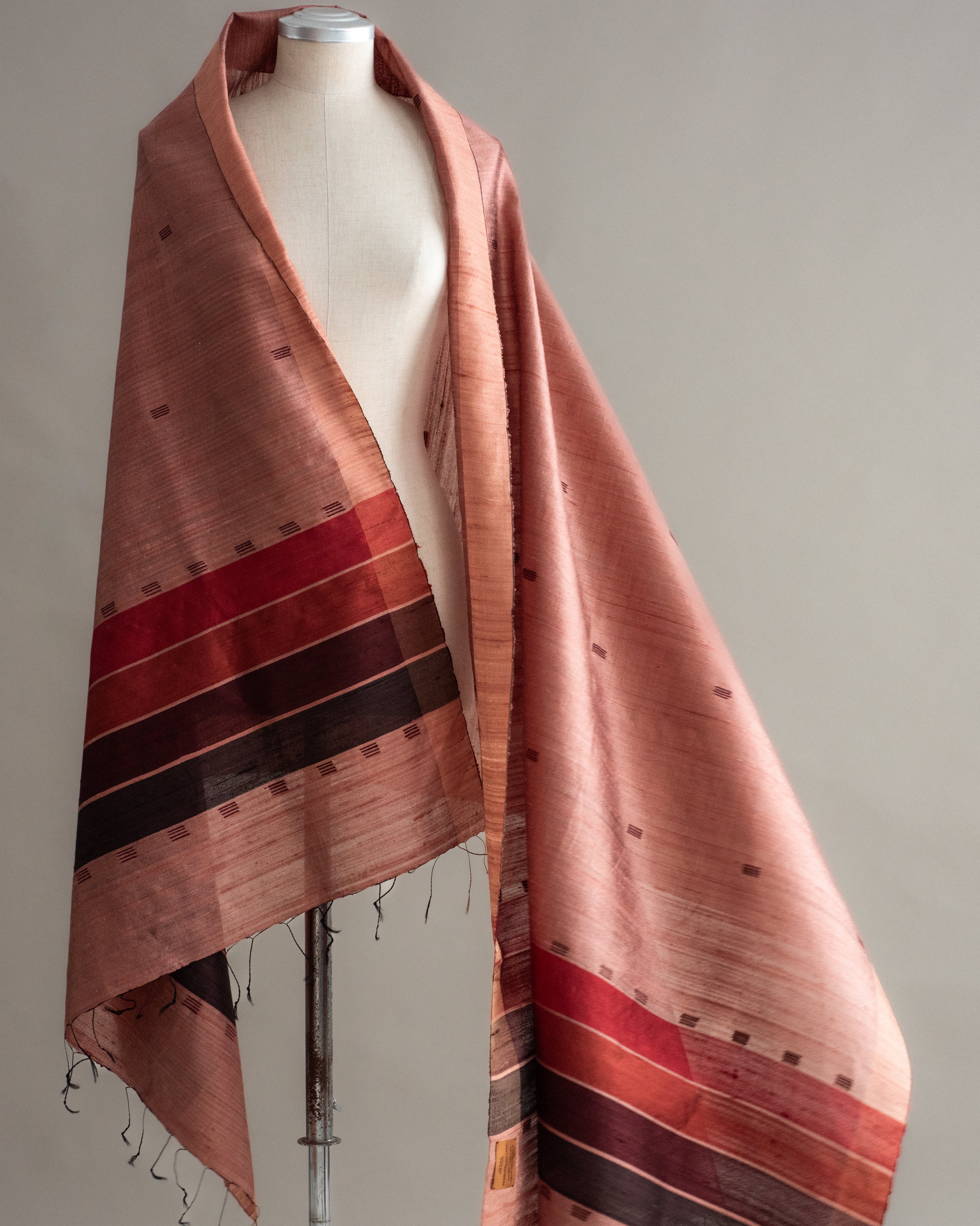 Este xale de Seda Tussar também chamada selvagem é uma peça inteiramente artesanal. Os casulos destas seda são silvestres e não de cultivo. Ele são fervidos e desenrolados manualmente e depois tecidos em antigos tradicionais teares da região de Baghalpur, na India. Esta região é conhecida por ser grande produtora de sedas tussar. Um xale tamanho extra grande, textura leve, muito macio, cores brilhantes. Acabamento em finas franjas enroladas manualmente.Seu brilho e textura de extrema elegância fazem dele um xale para acompanhar trajes de festa.