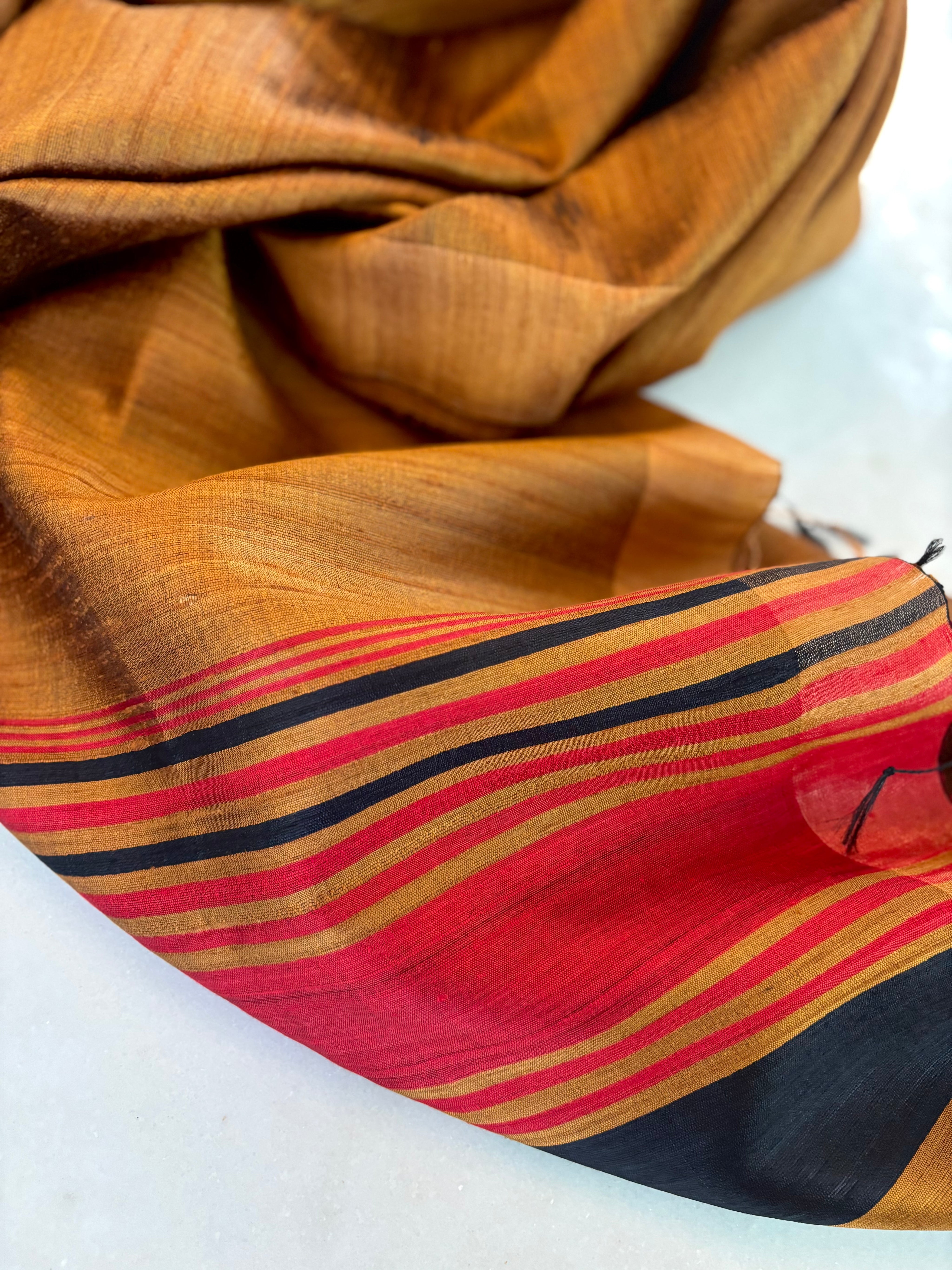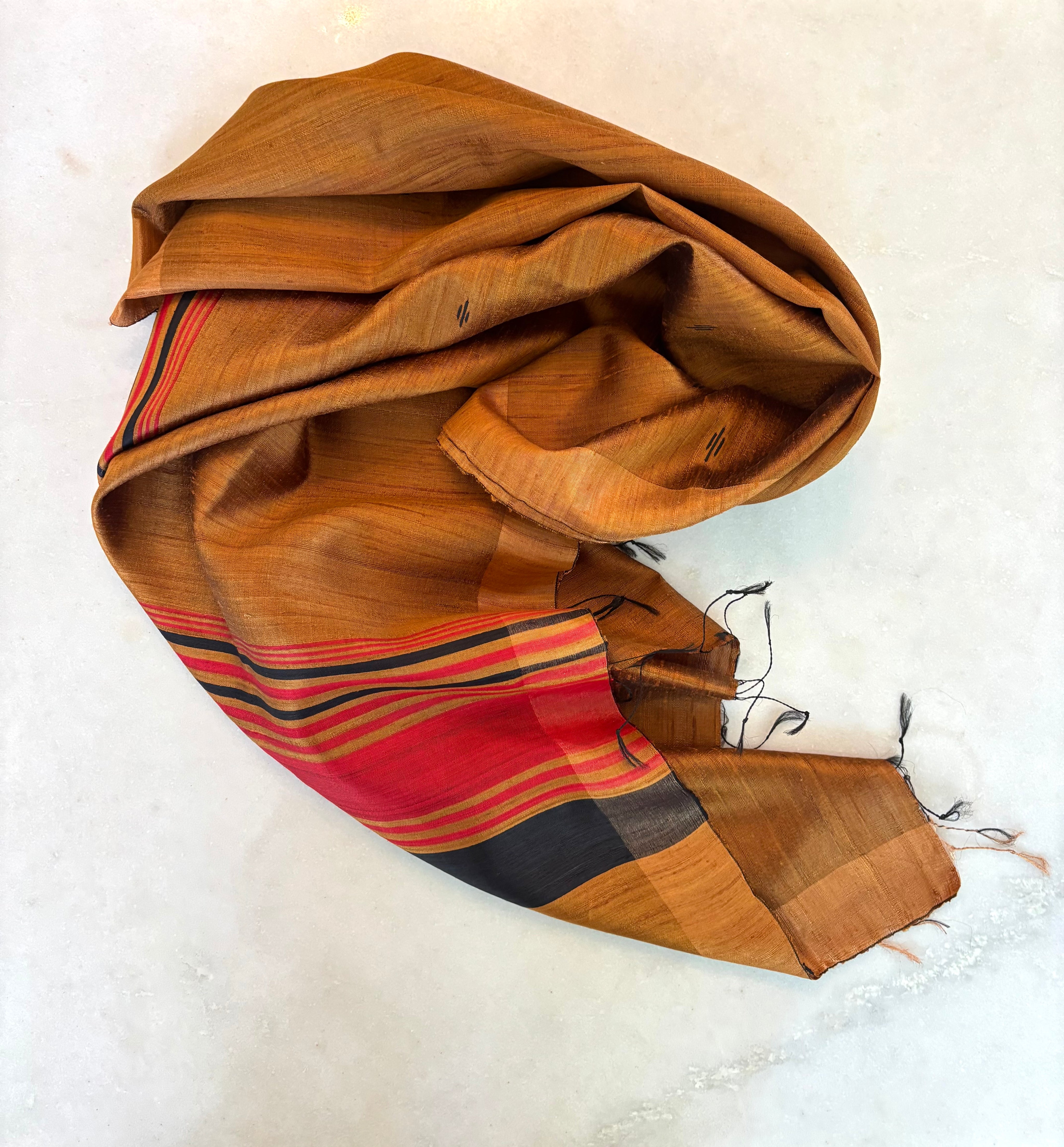 Este xale de Seda Tussar também chamada selvagem é uma peça inteiramente artesanal. Os casulos destas seda são silvestres e não de cultivo. Ele são fervidos e desenrolados manualmente e depois tecidos em antigos tradicionais teares da região de Baghalpur, na India. Esta região é conhecida por ser grande produtora de sedas tussar. Um xale tamanho extra grande, textura leve, muito macio, cores brilhantes. Acabamento em finas franjas enroladas manualmente.Seu brilho e textura de extrema elegância fazem dele um xale para acompanhar trajes de festa.